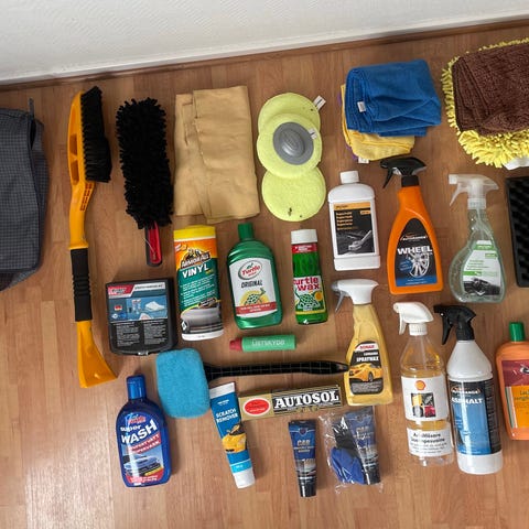 En låda med diverse bilvårdsprodukter, efter garagetömning.