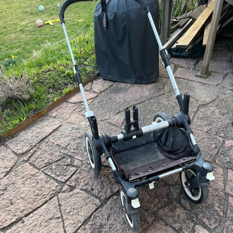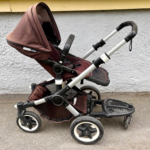 Bugaboo syskonvagn med två sittdelar, varav en kan användas som liggdel. Vagnen är utförd i grå textil med svart och silverfärgad stomme. Den har fyra hjul, svängbara framhjul och justerbart handtag. Passar för två barn samtidigt, exempelvis syskon i olika åldrar. Under vagnen finns en varukorg för förvaring. Sufflett på båda delarna ger sol- och vindskydd. Klädsel och selar är anpassade för barnsäker användning vid promenader och vardagskörning. Den är 8 år gammal och har använts i perioder under denna tid.