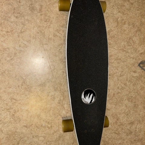 Dunavien longboard med svart griptejp på ovansidan och vit undersida med grafiskt mönster. Utrustad med svarta truckar och lila hjul. Passar för cruising och pendling på asfalt och andra släta underlag.