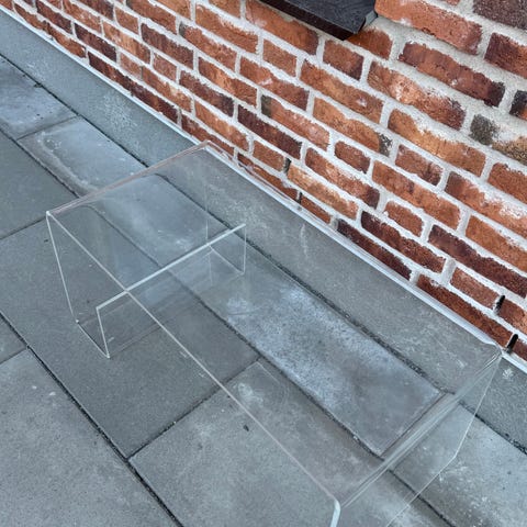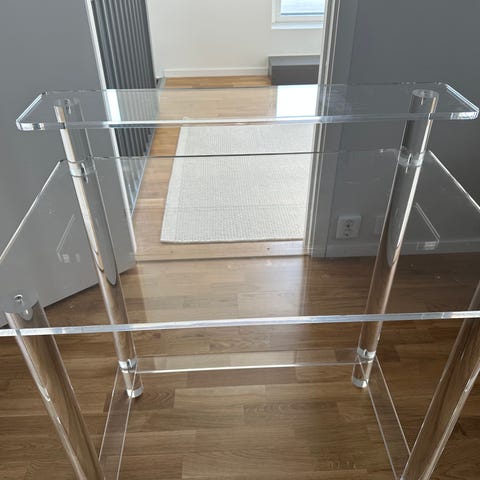 Bricka med ben, bord, sidobord, nattduksbord. Genomskinlig i plast. Har små sprickor vid som dock inte stör funktionen. Hopfällbart, Compact leaving, funktionellt.