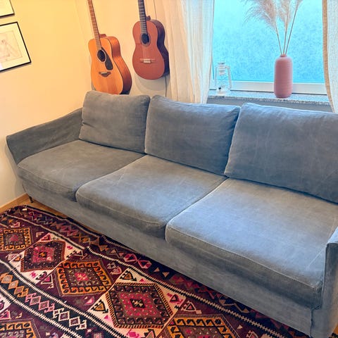 Frambenen på soffan är utbytta men jag har kvar de gamla benen som man lätt kan byta tillbaka till. Den är i gott skick och har inga anmärkningsvärda slitage.