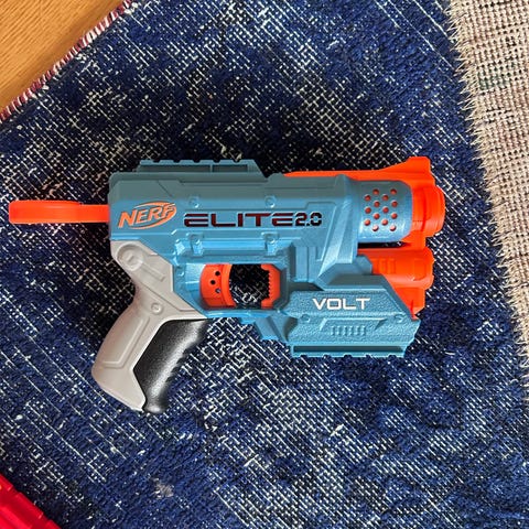 Nerf Surgefire leksakspistol i blå och orange plast. Modellen har roterande trumma för pilar och axelstöd baktill. Utrustad med sikte på ovansidan. Avsedd som leksaksvapen för barn och unga vid inomhus- eller utomhuslek med skumpilar.