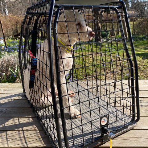 Hundbur för bil i svart metallgaller. Sned bak- och framsida anpassad för montering i bilens bagageutrymme. Öppning fram med gallerdörr. Lämplig för transport och säker förvaring av hund i bil. Stabil konstruktion i metall med plan botten som kan kompletteras med filt eller dyna efter behov.
