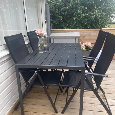Möblerna är i mycket gott skick och är både snygga och praktiska. Stolarna är fällbara vilket gör dem enkla att förvara. Bordet är rymligt och passar perfekt för middagar eller fika utomhus.