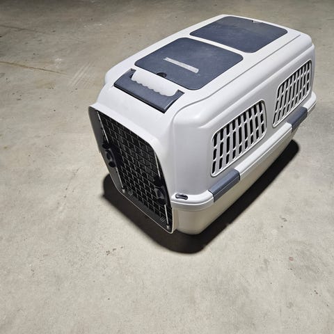 Transportbur för smådjur i plast med gallerlock och gallerdörr. Överdel i ljus plast med ventilationsöppningar runt om och bärhandtag på ovansidan. Underdel i blå plast. Passar exempelvis mindre katter, små hundar eller andra smådjur vid transport till exempelvis veterinär eller resa i bil.