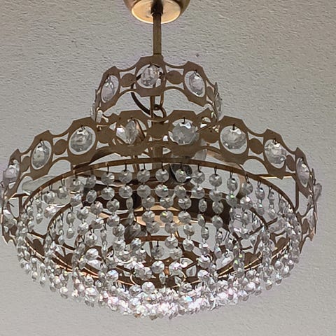 Taklampa med stomme i mässing och prismor i glas. Lampan har en detaljerad mässingsram och är prydd med flera rader av klara glasprismor som reflekterar ljuset. Den är avsedd för takmontering och ger ett spritt ljus. Lampan är lämplig för inomhusbruk.