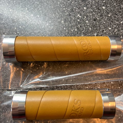 Brooks handtag för cykel i svart läder med ändar i aluminium. Handtagen är utformade för montering på styre och har klämfästen. Passar som ersättningshandtag eller uppgradering på cyklar med kompatibelt styre.