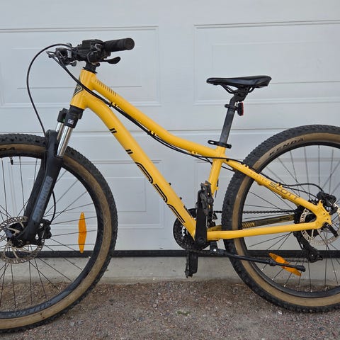 Scott barncykel med 26" hjul. Cykeln har gul ram, raka styre och sadel anpassad för barn/ungdom. Utrustad med grovmönstrade däck som passar för både väg och lättare terräng. Pedaler och kedjeskydd ingår. Lämplig som vardagscykel eller fritidscykel för barn som vuxit ur mindre hjulstorlekar.