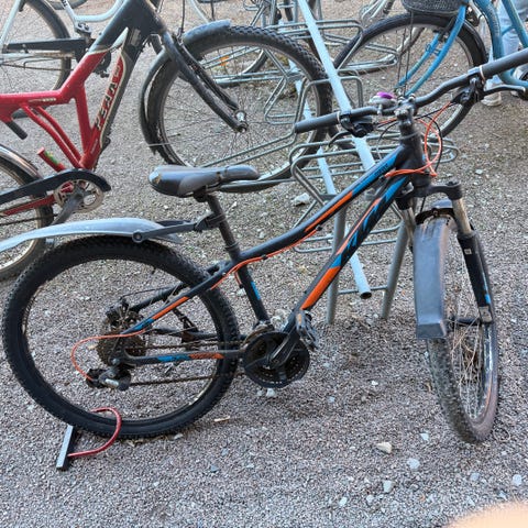 Haibike barncykel med 24" hjul. Cykeln har ram i svart med orange och turkosa detaljer. Utrustad med framgaffel med fjädring, grovmönstrade däck och raka styren med handbromsar. Lämplig som barn- eller juniorcykel för vardagscykling och enklare terrängkörning.