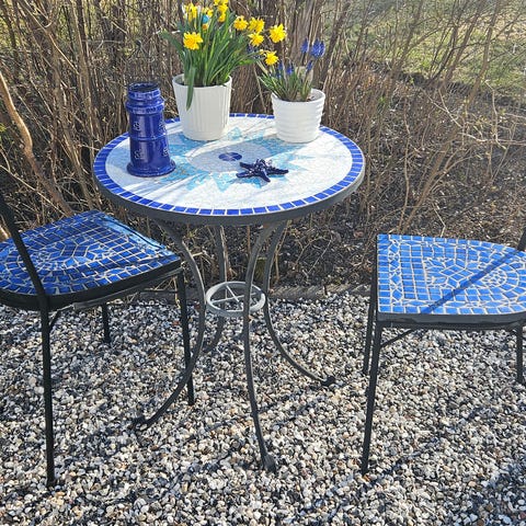 70 cm i diameter, 73 cm högt. Bordställningen är vikbar.