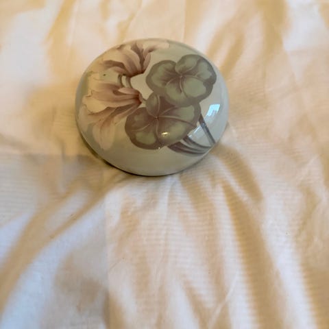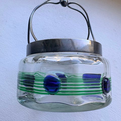 Tillverkat i flintgods under tidigt 1900-tal med tydlig jugendkänsla. Dekorativ modell i mjuka gröna och rosa toner.