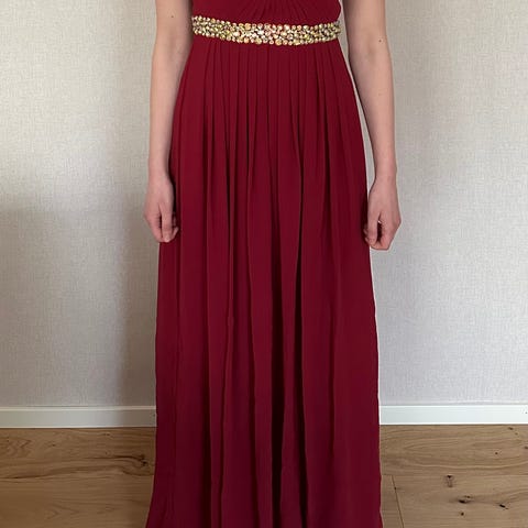 Bal-/festklänning från DFI Los Angeles i storlek M. Plommonlila färg med pärlor på axelbanden och ner över urringningen. Lång modell med rynkad överdel. Material: Polyester. Sjal ingår. Klänningen är endast använd en gång och är i mycket bra skick