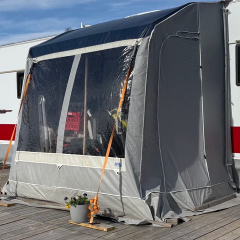 Kökstält Java från Inaca. Material PVC, 6 st gardiner och myggnät i fönstret mittemot dörröppning .