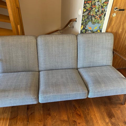 Sits behöver tvättas eller kläs om . Enkelt att häfta runt själv . Ryggdynorna i bra skick . En del märken på ena träsidan med ålderns rätt ( se bild ).