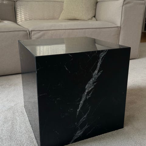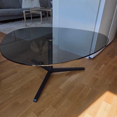 Soffbord köpt på MIO för 2 år sedan. Glasbord med marmormönster. Vill man ha extra stabilitet så glasskivan ej blir rörlig kan man köpa till glasbordspads/självhäftande gummifötter.