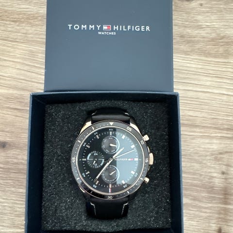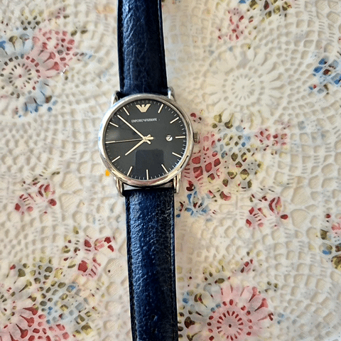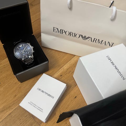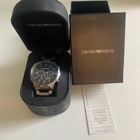 Armani Emporio herrklocka med rund boett och mörk urtavla. Klockan har kronografvisning med tre mindre suburtavlor samt datumvisning. Boett och länkarmband är i silverfärgad metall. Levereras med originalask och manual enligt bilder. Passar för man enligt angiven målgrupp.