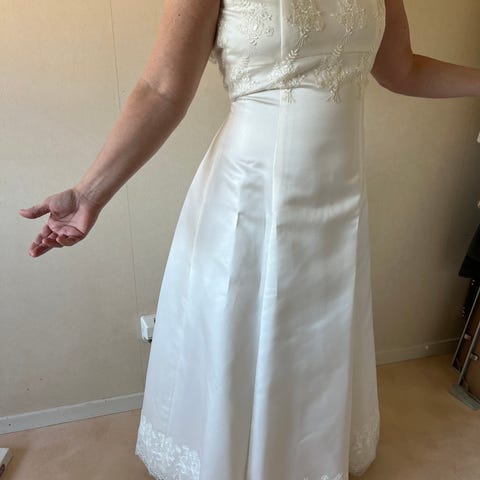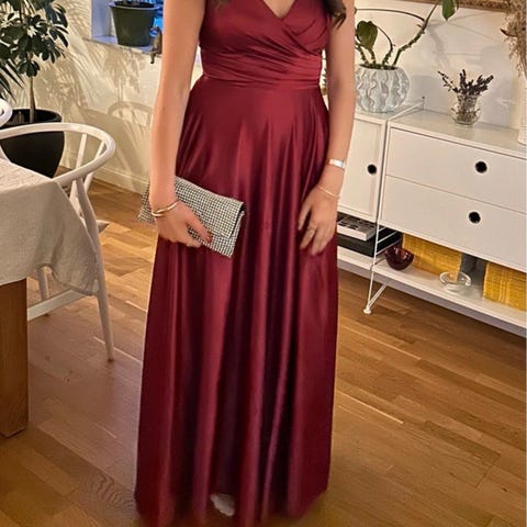 Lång, ateljésydd balklänning material från NKs franska avdelning. Midjemått 75 cm. Min längd 164 cm. Jacka i helsiden plus rosett till håret. Även guldskor i strl 38. Ring 018-342336.