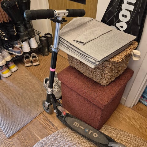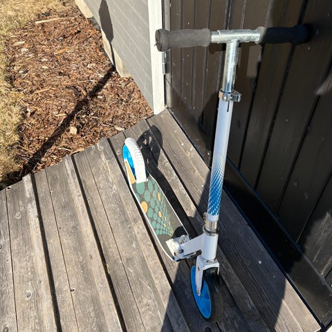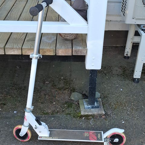 Micro kickbike i silverfärg med svart styre. Modellen har två hjul, och fotbroms. Styret har skumhandtag. Svår att fälla ihop, kanske lite rost.