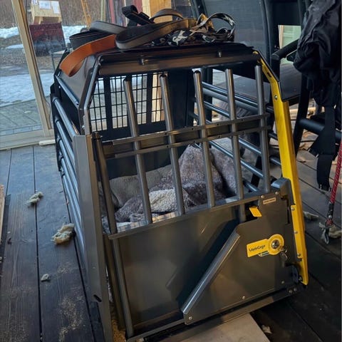Har också en bur i plast som är godkänd för flygplanstransporter.