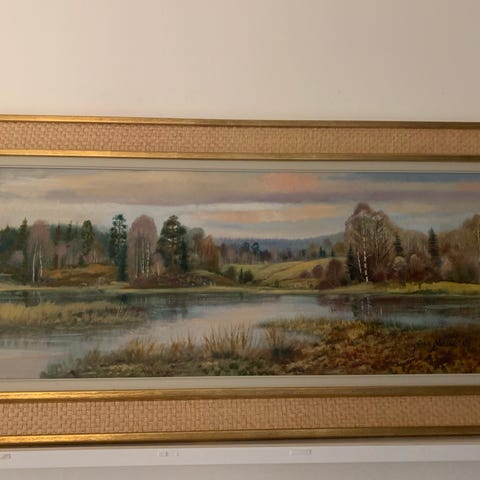 Tavla med landskapsmotiv föreställande ett hus vid en sjö, omgiven av träd och kullar. Mjuka pastellfärger dominerar motivet med inslag av rosa, brunt och blått. Tavlan är inramad i en enkel guldfärgad ram. Passar som väggdekoration i vardagsrum, hall eller sovrum. Vi är inte säkra på om det är akryl eller oljemålning.