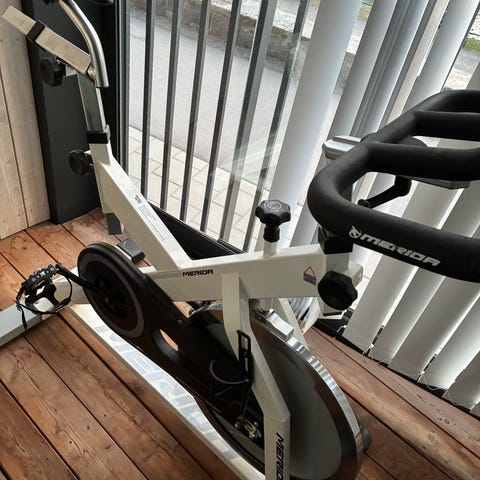 Master B4140 motionscykel i vit och grå färg. Utrustad med digital display för att visa träningsdata samt olika förinställda program. Justerbart säte och styre för att passa olika användare. Pedaler med remmar för stabil fotplacering. Lämplig för inomhusträning och konditionsträning i hemmet.
