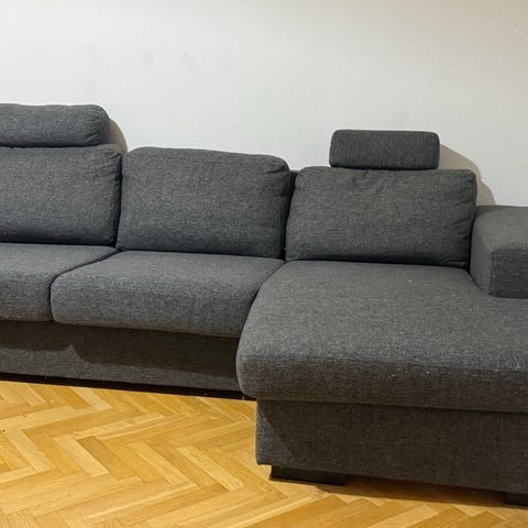 Hörnsoffa tyg grå med schäslong och förvaring