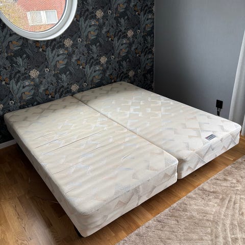 Hilding Tusensköna kontinentalsäng i beige tyg. Sängen består av två underdelar med gemensam resår- och bäddmadrass ovanpå, vilket ger en jämn liggyta. Överdelen är quiltad med knappsydd yta. Passar som dubbelsäng i sovrum.