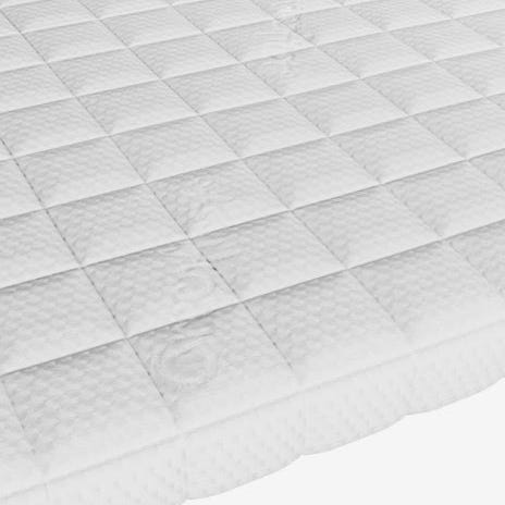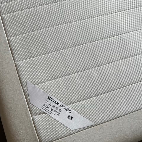 Bäddmadrass med överdrag i ljus textil med struktur och kantband i mörk färg. Passar som extra komfortlager ovanpå madrass eller resårbotten i säng.