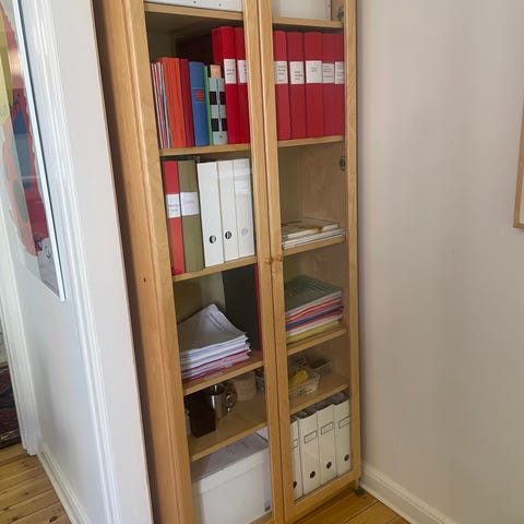 2 st Billy IKEA bokhylla med vitrindörrar, björkfärgade. (Innehåll ingår ej, töms av säljaren före hämtning.)