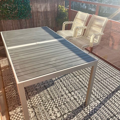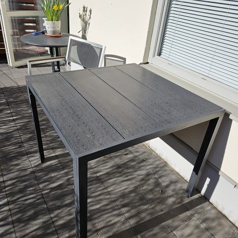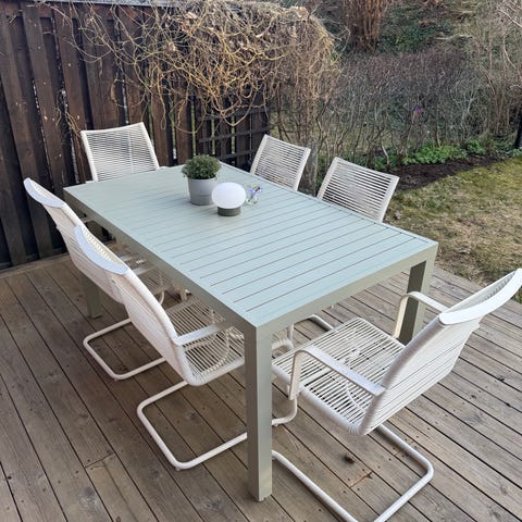 Matgrupp för utebruk bestående av rektangulärt bord med mörk glasbordsskiva och sex stolar i svart flätad design. Bordet har raka ben i metall. Stolarna är i metall med flätad plast. Helt men använt skick. Finns dynor till alla stolar. 190cm x 90cm