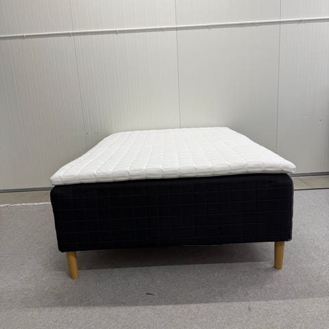 IKEA Skotterud säng med grå klädsel och träramar på benen. Ovanpå ligger en IKEA Sauland bäddmadrass i vitt. Sängen har vadderad, rutmönstrad tygklädsel och raka träben som ger en stabil bas. Bäddmadrassen är quiltad och ger ett extra komfortlager ovanpå sängen. Passar som komplett sovplats i sovrum eller gästrum. Storlek och exakta mått framgår inte av uppgifterna och kan behöva mätas vid behov.