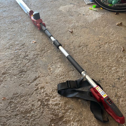 Elektrisk teleskop grensåg. Ca 2,5m räckvidd. Sågen har ett långt teleskopskaft som gör det möjligt att nå och såga grenar högre upp utan stege. Huvudet kan vinklas 40°. Handtaget är utformat för tvåhandsfattning och har bärrem för bättre avlastning vid användning. Sågdelen sitter längst ut på skaftet och är avsedd för kapning av grenar på träd och buskar i trädgårdsmiljö.