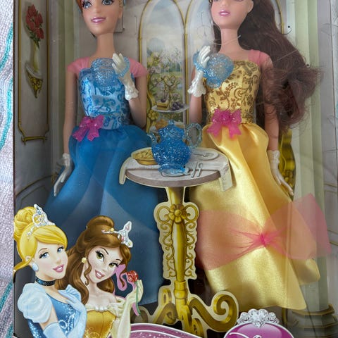 Disney dockor set. Flera olika dockor med kläder, bland annat karaktärsdockor i klänningar i lila, blått och rosa samt en babydocka i rosa sparkdräkt och mössa. Passar för lek och rollekar inomhus. Material huvudsakligen plast och textil.