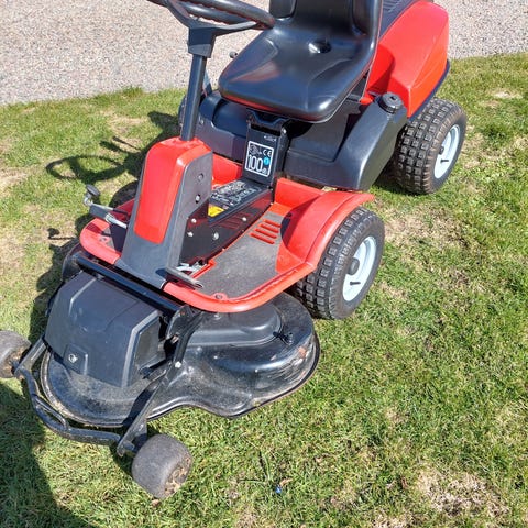 Smidig åkgräsklippare med uppsamlare! Den startar och går fint, men remmen till klippaggregatet har hoppat av. Det rycker lite vit rök pga misstänkt oljespill eller lättare läckage. I övrigt fungerar den bra och rullar på fint. Det medföljer laddare till batteriet.