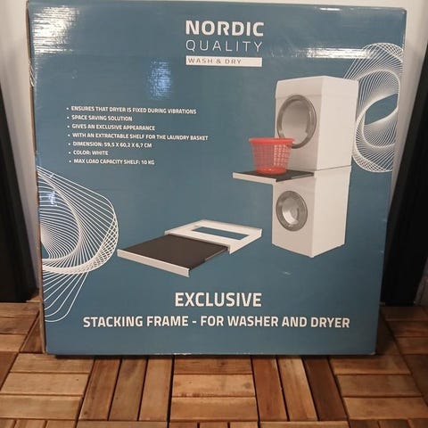 En helt ny oöppnad monteringsram för tvättpelare (mellan tvättmaskin & torktumlare) med utdragbar hylla för tvätt/tork.