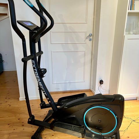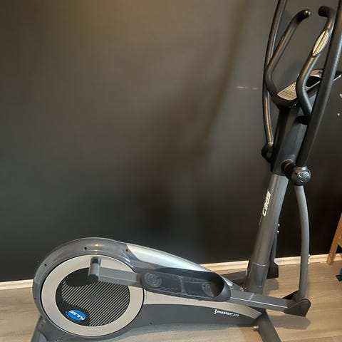 Master Fitness crosstrainer för hemmaträning. Maskinen har display med olika knappar för inställning av motstånd och träningsprogram samt handtag med flera greppmöjligheter. Fotplattor med struktur för bättre fäste. Strömanslutning visas på bild med lös kontakt. Tyvärr glapp i kontakt men funkar annars felfritt .