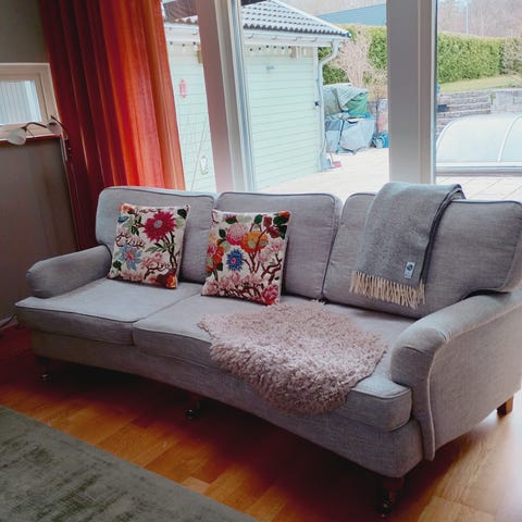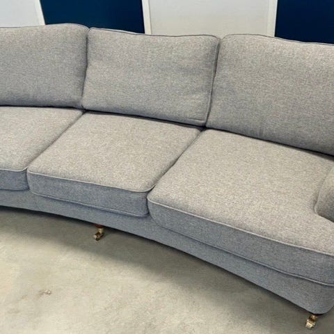 Soffa 3-sits i mörkgrått tyg. Modellen har svängd front, lösa sitt- och ryggdynor samt rundade armstöd. Klädseln är i vävt tyg med melerad struktur. Soffan står på ben med små hjul framtill. Passar som sittmöbel i vardagsrum eller liknande utrymme.