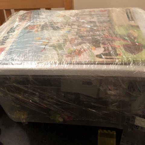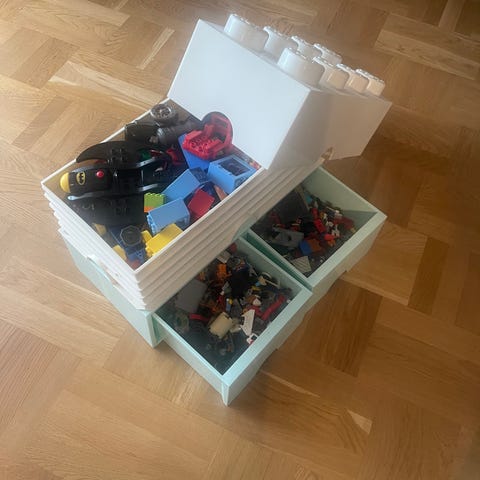 Lego Duplo byggklossar i blandade färger. Innehåller olika typer av Duplo-bitar, figurer samt byggplattor, lämpliga för barns lek och byggande. Levereras samlat i en plastlåda enligt bild. Finns ett duplo hus, slott , bland annat