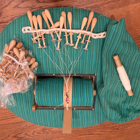 Knyppeldyna och många tillbehör. Läroböcker, tråd, knyppelpinnar och massor av mönster ingår.