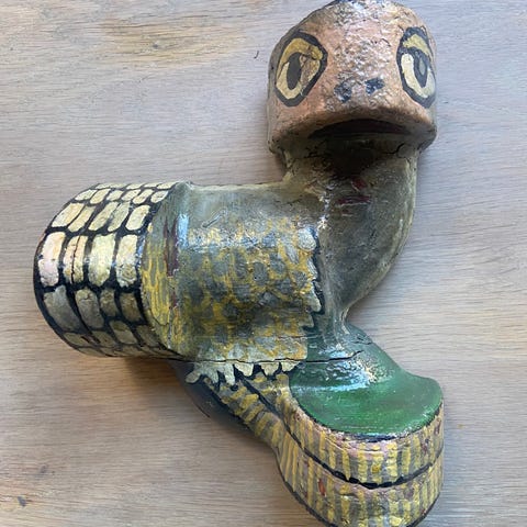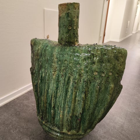 Detta är en Tamegroute-vas från södra Marocko, handgjord i lera med den karakteristiska djupgröna glasyren. Vasen har en unik form med flera mynningar, där en större central mynning omges av mindre på olika höjder. Den kombinerar dekorativ design med funktion, och varje exemplar blir unikt genom glasyrens naturliga variationer.