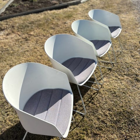 Är inköpta på Jysk för 4 år sedan. Har lite skråmor och är något missfärgade i sitsen, men överlag i bra skick, då de har stått täckta varje vinter.