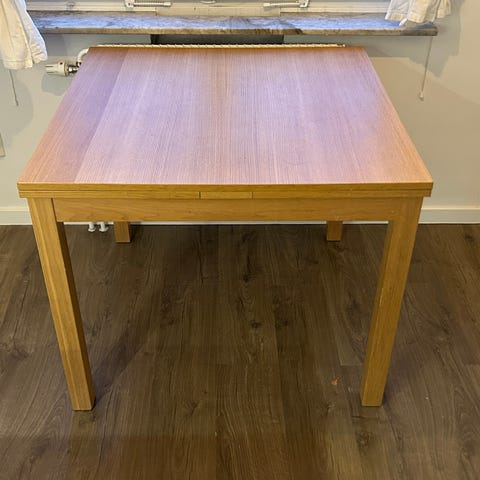 Behändigt bord där man vrida och vika ut skivan och få en dubbelt så stor bordsskiva.