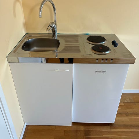 Teka minikök med spis och diskbänk. Enheten har två elektriska plattor med vredreglage samt integrerad diskho i rostfritt stål med blandare. Underdel med vita skåpsluckor och förvaring. Passar som kompakt kökslösning i mindre utrymmen som gästhus, kontor eller studentboende.