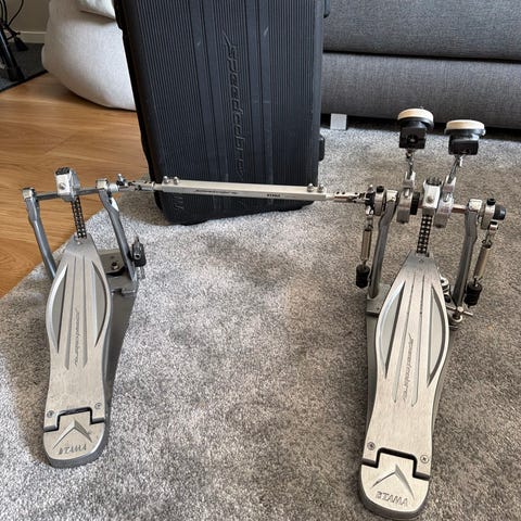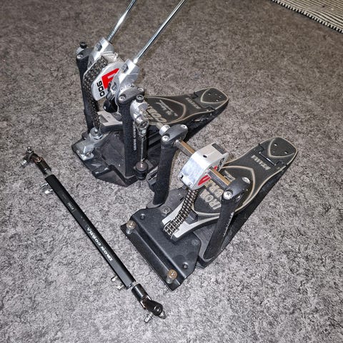 Pearl dubbelpedal för bastrumma till trumset. Pedalen har två slag och är hopkopplad med en justerbar drivaxel mellan huvudpedal och slavpedal. Konstruktion i metall med fotplattor i silver/svart och kedjedrift. Avsedd för montering på bastrumma i ett akustiskt trumset och passar trummisar som vill spela med dubbelpedalsteknik.