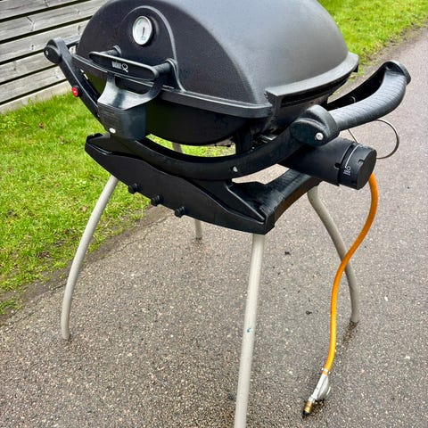 Char‑Broil All-Star 1b elgrill med stativ. Grillen har lock med inbyggd termometer och rund grillrist i gjutjärn. Sidobord på båda sidor ger extra avställningsyta och grillen står på stativ med hjul för enkel förflyttning. Till grillen hör även ett svart överdrag för förvaring och skydd mot väder. Medföljer gör även skärbräda och hållare för torkrulle. Endast använt en säsong.