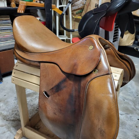 En helt unik stocksadel som kom till Sverige från Australien för 30-40 år sedan. Sadel är aldrig använd utan köptes av min mamma som sen aldrig började rida. Den är alltså inte i nyskick men den är heller aldrig använd. Hon samlar på allt. En sån här sadel kommer du inte se någon annan med. Lädret på stigläderna kan du ha både under benet som fendrar eller över benet som skydd mot tjurhorn och allt möjligt som vi så ofta stöter på på våra ridturer. Kanske mest grenar, väder och vind. Kan justeras upp eller ner. Massor av ringar att fästa saker i. Mätt med tumstock är sitsen 45cm från front till bak.