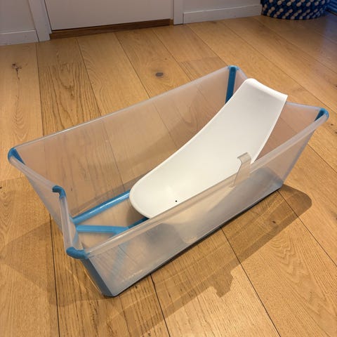 Stokke Flexi Bath babybadkar med insats i vit plast. Badkaret är hopfällbart för enkel förvaring och har halkskydd i botten samt propp för tömning av vatten. Insatsen ger extra stöd för mindre barn under badet. Lämpligt för användning i hemmet eller vid resor där ett kompakt badkar behövs.