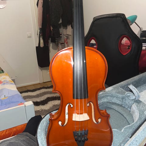 Nytaglad stråke ingår, samt stort hårt case.