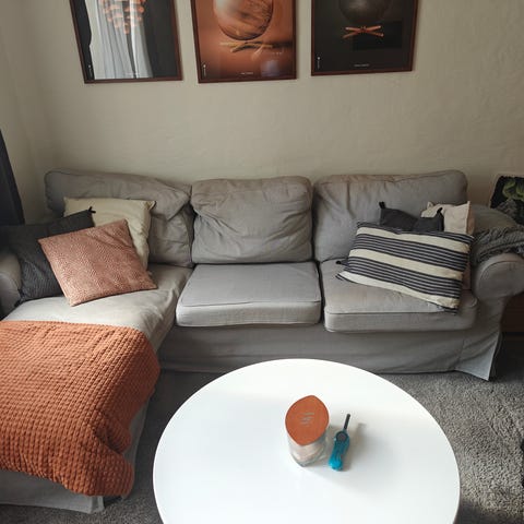 Sittkuddarna i soffan är av dun, vilket gör att den trots sina år på nacken inte är nersutten, tack vare att man kan puffa till kuddarna ordentligt. 😊