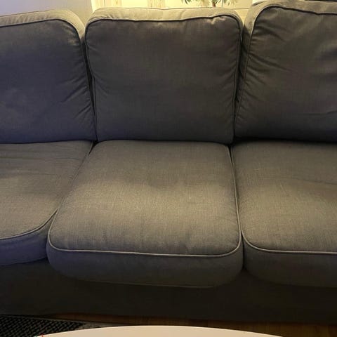 Soffan och fotpallen köptes begagnade av oss för 5 år sedan, klädseln köptes ny 2021 och är färgen Ikea Totebo Ljusbeige, som idag utgått.
